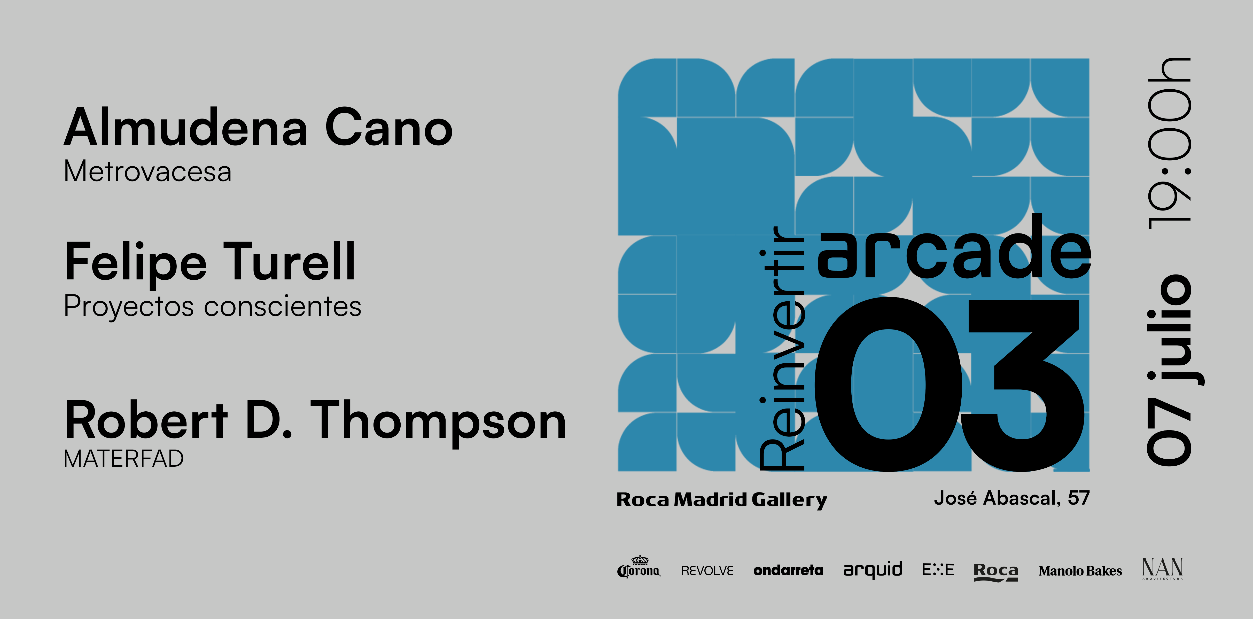 “ARCADE 03. REINVEST” will take place on July 7 at 7:00 PM at the Roca Madrid Gallery (Calle de José Abascal, 57, Madrid) with the support of Roca, Manolo Bakes, Corona, Ondarreta, NAN Arquitectura, and REVOLVE, featuring speakers from the real estate developer Metrovacesa, the sustainable restoration team Proyectos Conscientes, and the center for innovative materials MATERFAD.