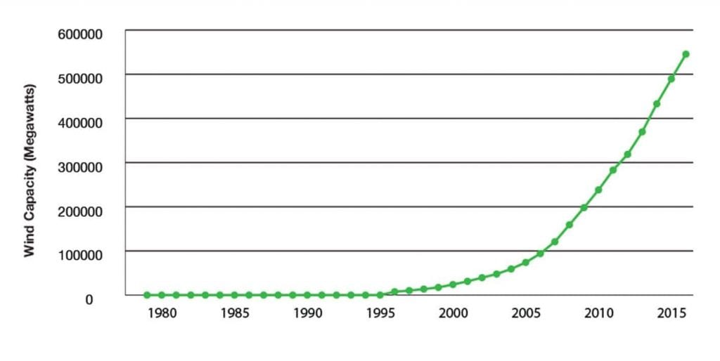 Renewable energy (particularly wind and solar) has shown exponential growth. What was once a niche technology is now firmly in the mainstream and renewables will capture 2/3 of global investment in power plants by 2040 as they are for many countries the least cost-energy generation source according to the International Energy Agency World Energy Outlook 2017.The cost of onshore wind turbines has fallen dramatically in the last decades. Meanwhile, wind power is the cheapest energy to produce in Germany and the United Kingdom even without subsidies. The prices can even go below zero, meaning consumers are paid to use electricity because of surplus supply of energy. Germany experienced negative electricity prices more than 100 times in 2017. Furthermore, renewable electricity supply now meets more countries’ needs for energy – this was the case in Germany, Portugal and Denmark in 2018. Wind could supply 40 times of all the electricity used by our global economy.