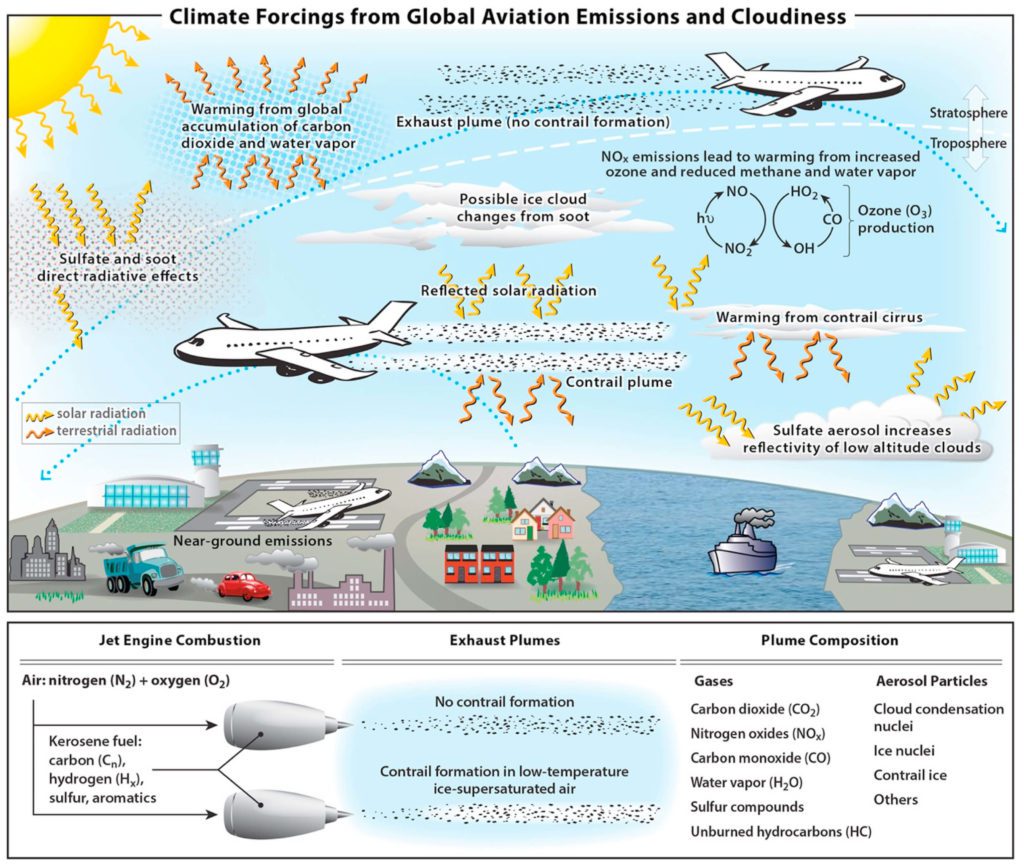 Global aviation (passenger and freight) contributes to a few percentiles of global greenhouse gas (GHG) emissions, including CO2, and contribute 3.5% of effective ‘radiative forcing’ (overall warming). Flying accounts for around 2.5% of global CO2 emissions, but 3.5% when we take nonCO2 impacts on climate into account. Contrails account for the largest share of nonCO2 warming, about 2/3 in total.