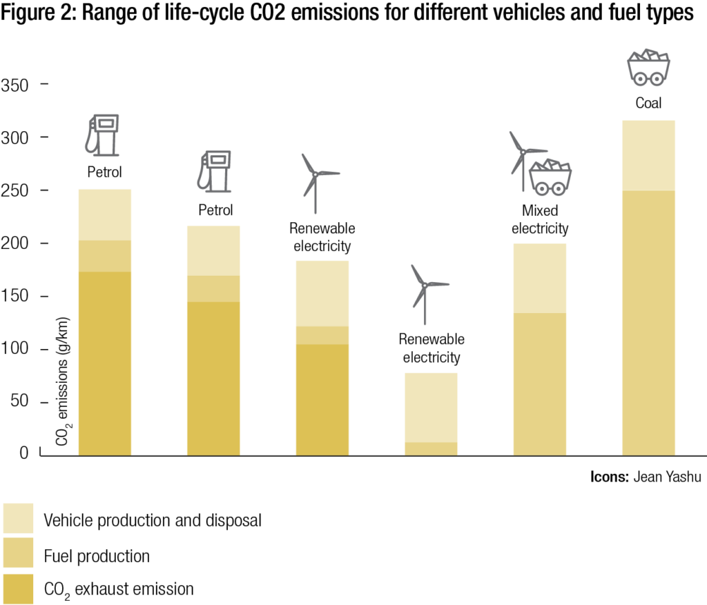 Several scenarios have been established to predict the embrace of EVs in the future, all pointing at a EV revolution hitting hard in the next decades. Models predict that EVs in the EU will range from 20-90 million units representing between 7-32% of the total fleet. Such growth, even in the pessimistic scenario, would have major impacts beyond the transport sector and primarily on the power sector, as the switch from fossil fuels to electricity will obviously increase global electricity demand. For instance, within the above-mentioned scenario, the electricity demand rises from 47 TWh to 202 TWh, which represents the annual production of 4 and 19 nuclear plants respectively. To be in line with GHG reductions, increased demand must be filled with renewable energy capacities: keeping the same 2015 energy mix of fossil fuels would drastically impede the potential gain on emissions (Figure 2).