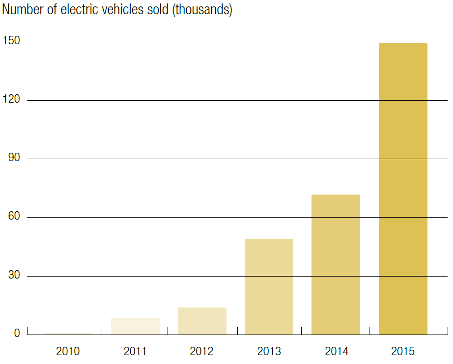 The main contributors to such high GHG emissions are private cars, which account for 58% of total EU GHG emissions, according to EUROSTAT, despite the fact that clean energy technological solutions already exist to replace fossil fuels with electricity (electric vehicles) and hydrogen (fuel cell vehicles). Among these options, EVs have strong and concrete potential to reduce dependence on fossil fuels by relying on hybrid systems (with a classic engine and an electric engine) or full electric systems. In recent years, EVs have witnessed impressive growth around the world. As reported by the International Energy Agency (IEA), registrations of electric cars hit a new record in 2016, with over 750,000 sales worldwide. China is by far the largest EV market in 2016, with 336,000 new electric cars registered, followed by the United States (US), where EV registrations in 2016 rebounded to 160,000 units after a slight drop in the previous years. Similar growth has also been observed in the EU (Figure 1) where sales numbers are not as impressive but several European countries are seeing significant EV uptake rates, such as Norway and the Netherlands.