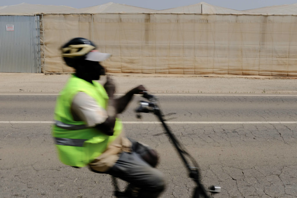 It is mid-July 2023 and many of the greenhouses are empty, lying in wait for the next planting season the following month. There is little action, although occasionally the silent and languid heat that has settled over the nameless dirt tracks is interrupted by a passing worker on an electric scooter. The odd truck emblazoned with images of vegetables trundles down the lanes of plastic.