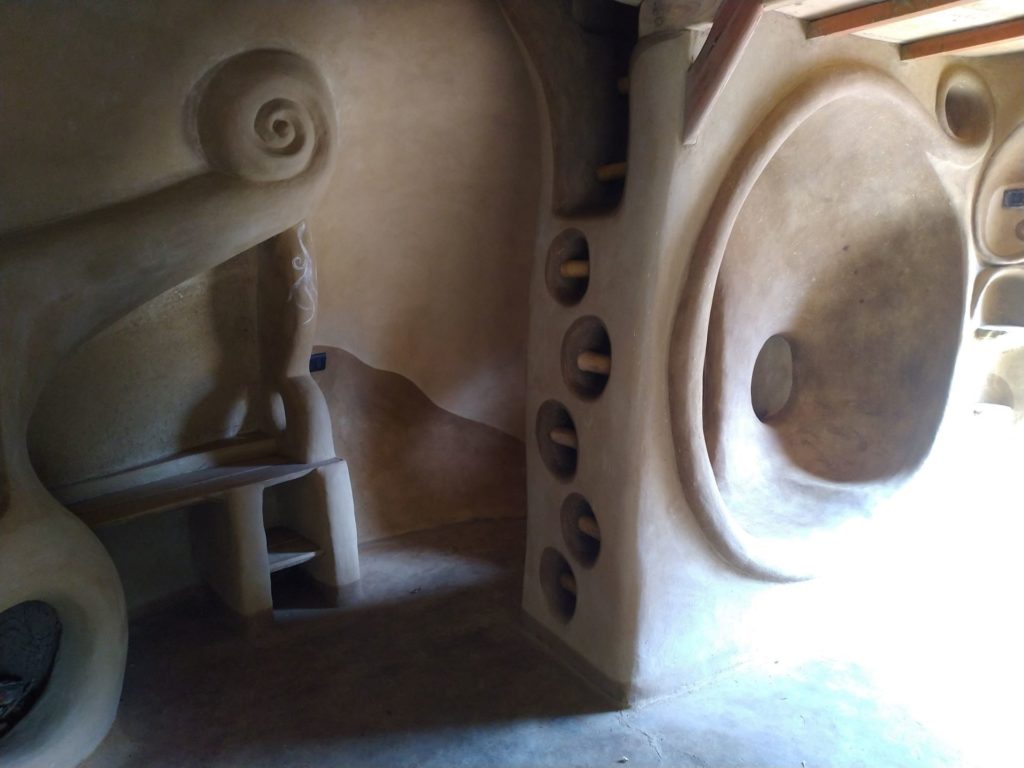 The process of making cob is similar to traditional wine-making in that we mix the materials with our feet. Everyone wanted to jump in and mix the cob, an activity that took a couple of weeks. The village children would help me make the mud plaster in the morning before they left for school, after which I would apply the plaster for the rest of the day. Even the adults joined in too.