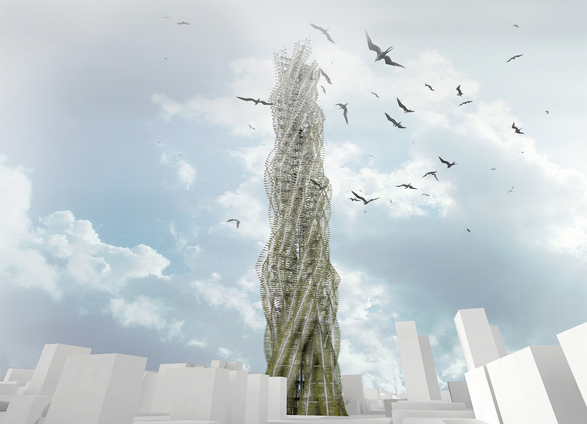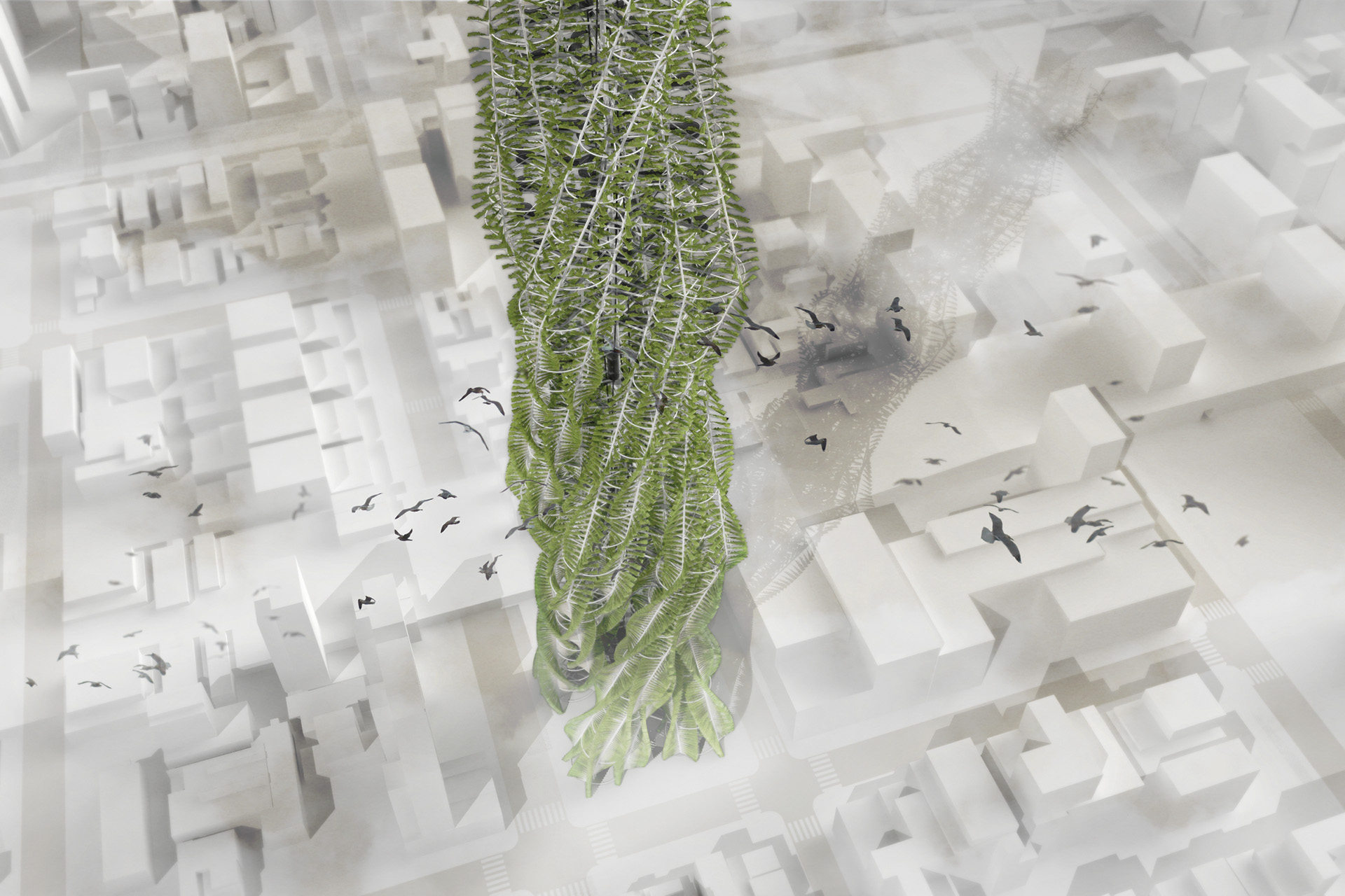 The incubator is a polyester shell covered with a Teflon-based translucent membrane that collects rainwater for irrigation. Sunlight infiltration is controlled through the membrane so that constant temperatures are maintained and direct sunlight is avoided. Minimizing the density at the higher level of the tower to enhance its porosity, the incubator expands as the plant grows and travels downward, eventually doubling in size.
