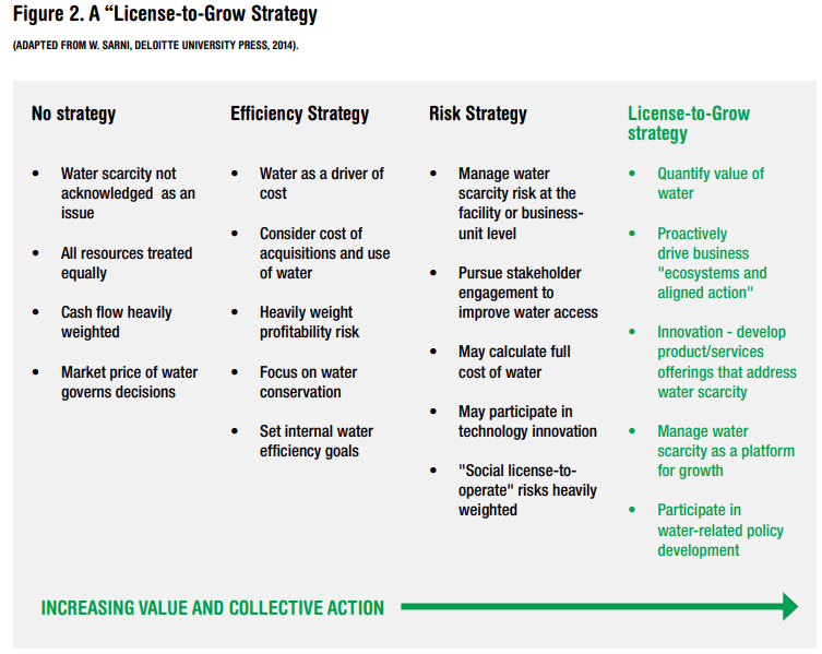 This question was addressed in “Fueling Growth” (Deloitte, 2014) that claims that for companies to capture additional value from water stewardship they must align with their growth strategy. This means moving beyond the price of water to take into account the various impacts of water on operations, value chain, brand, and growth prospects. As framed in the article, companies can be categorized in four stages of maturity as to how they align (or do not align) business growth to water availability (Figure 2).