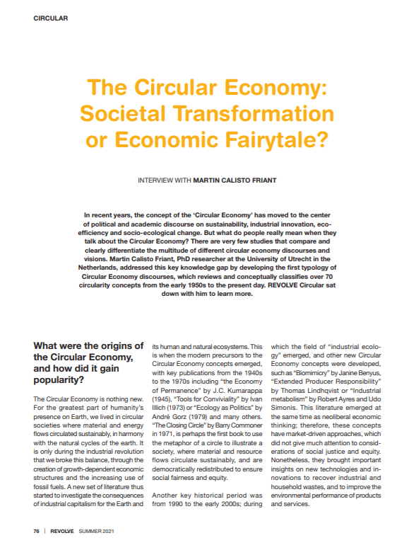 There are very few studies that compare and clearly differentiate the multitude of different circular economy discourses and visions. Martin Calisto Friant, PhD researcher at the University of Utrecht in the Netherlands, addressed this key knowledge gap by developing the first typology of Circular Economy discourses, which reviews and conceptually classifies over 70 circularity concepts from the early 1950s to the present day. REVOLVE Circular sat down with him to learn more.