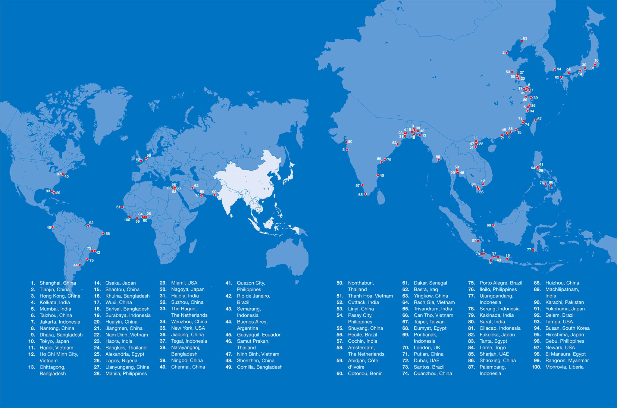 In 2015, Climate Central mapped over 200 cities that will be impacted by rising sea levels. Based on these projections, REVOLVE has highlighted the 100 most populous cities at risk of a 3°C rise in sea temperatures. While some cities, such as Amsterdam, are well prepared, many of the most populous cities, predominantly in East and South East Asia, are not.
