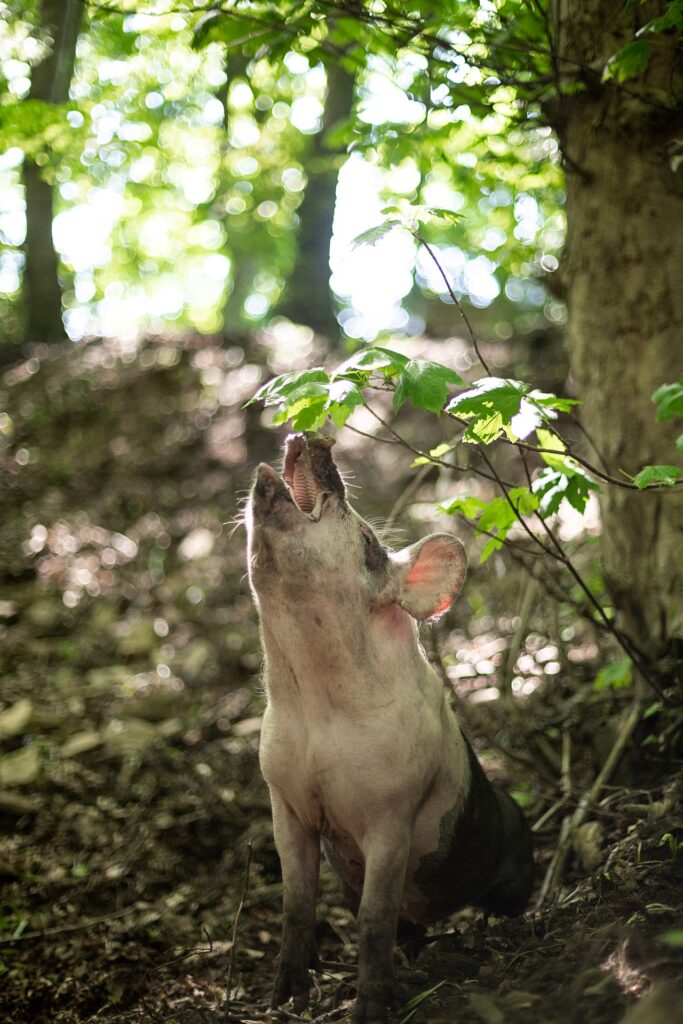Rescued piglet Patsy reaches up to eat some fresh green leaves from a woodland plant in dappled summer sunshine at Pigs In The Wood sanctuary. Pigs In The Wood, Huddersfield, West Yorkshire, England, UK, 2021. Photo: Tom Woollard / We Animals.
