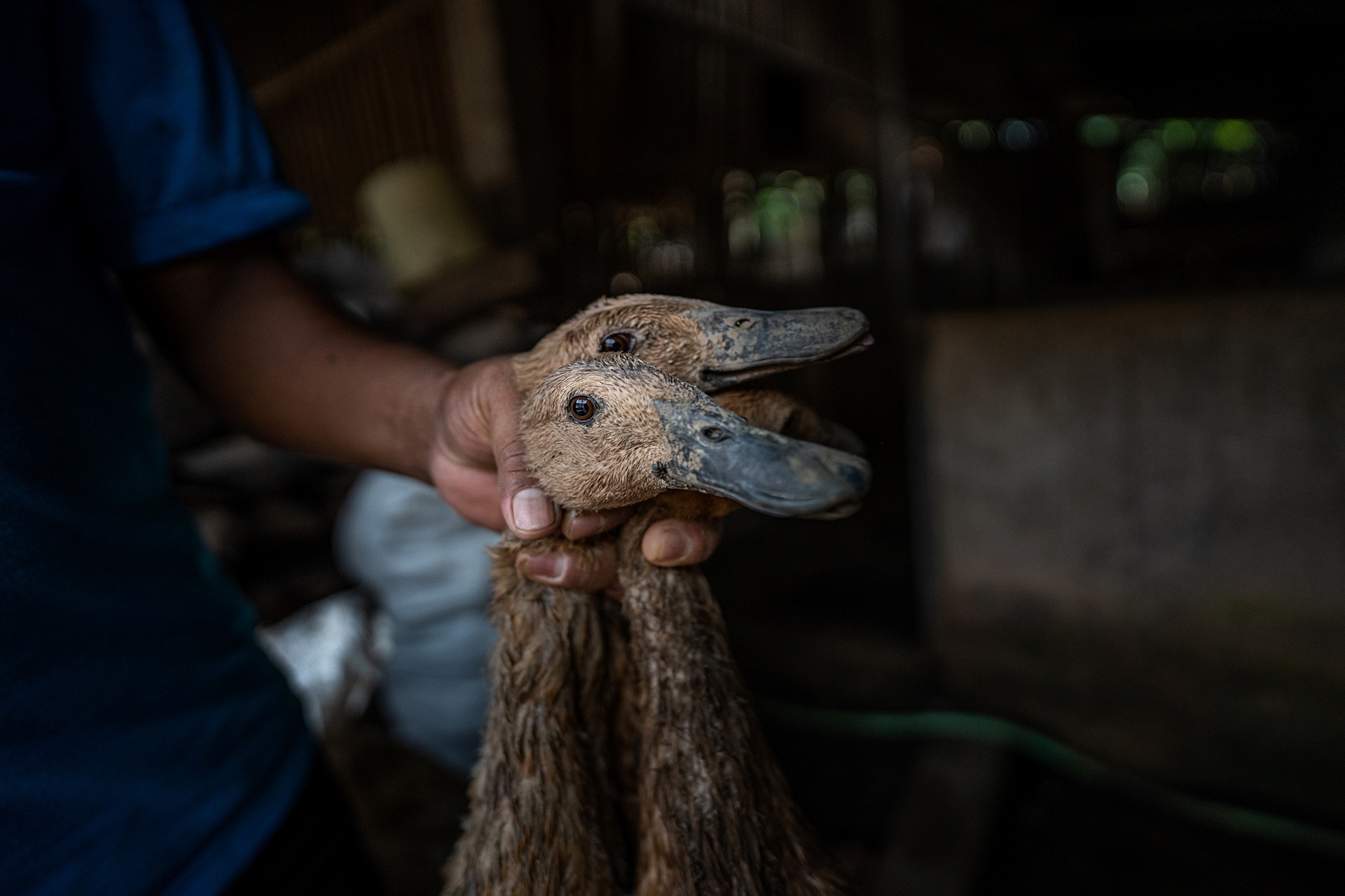 Ducks are grasped by their necks by a worker and taken from the holding pens to the kill floor of a small slaughterhouse in Indonesia. Close-up view. Indonesia, 2021. Photo: Haig / Act for Farmed Animals / We Animals.