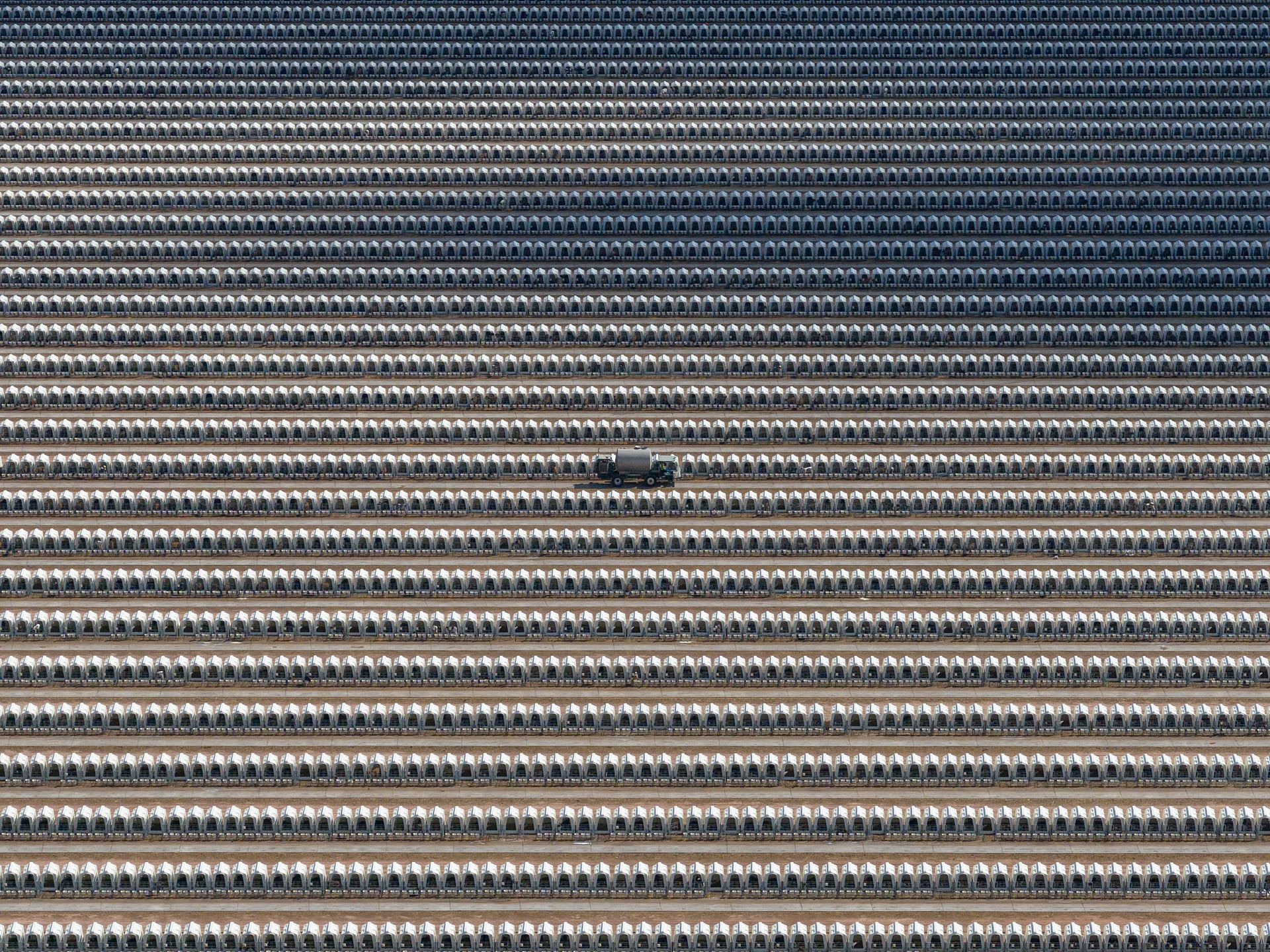 A milk dispenser truck drives between some of the thousands of calf hutches in a massive dairy farm’s yard. Turkey Creek Dairy, Pearce, Arizona, USA, 2023. Photo: Ram Daya / We Animals.