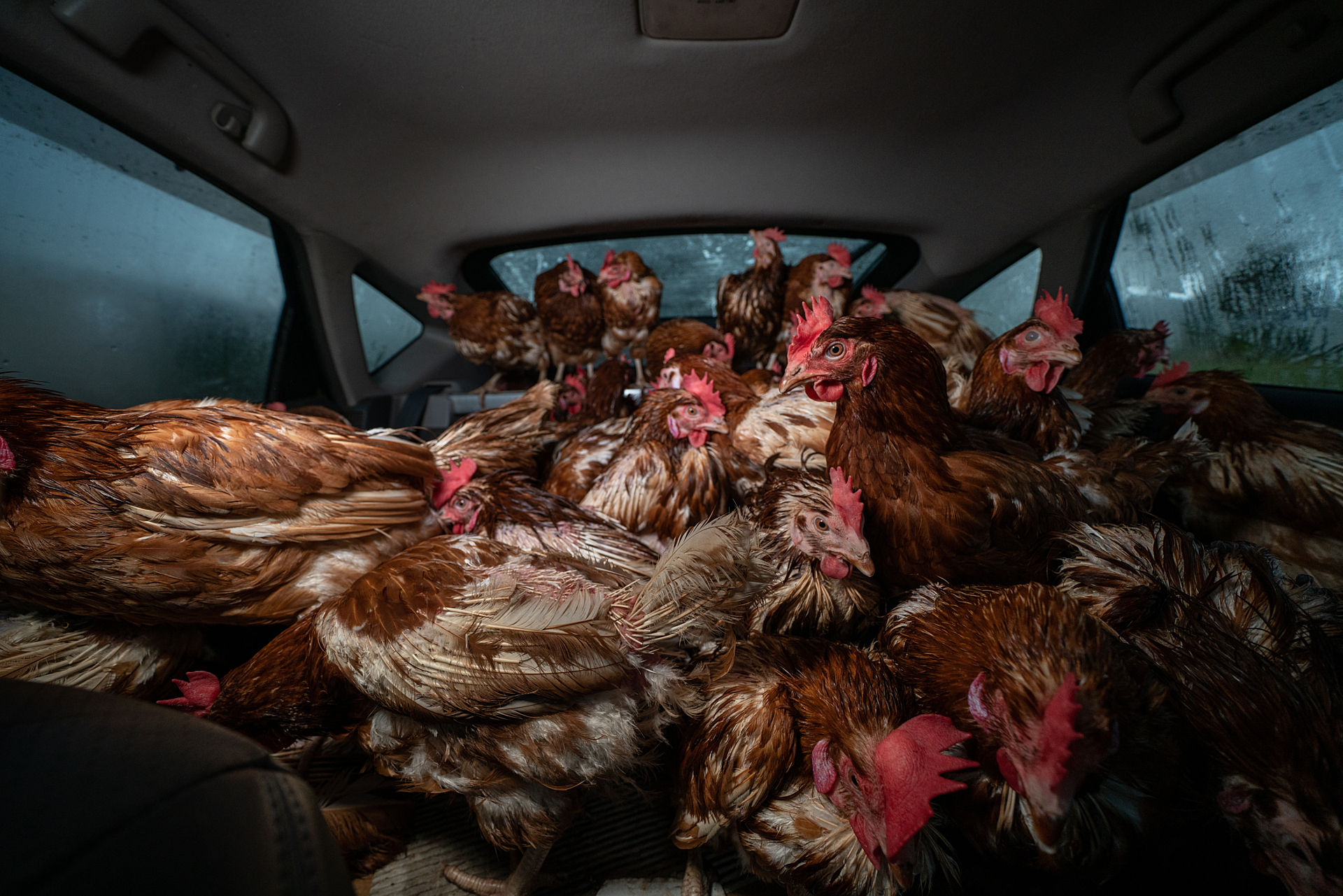 Seventy-two rescued laying hens deemed “spent” by an egg farm, their laying days over, sit in the back of a rescuer’s vehicle. Moments before these hens were to be gassed at the farm in a modified dumpster, the rescuers inquired if they could save any of the hens. After being told by farm workers they could “take as many as you like,” the rescuers filled two cars with hens, saving 140 individuals and safely transporting them to sanctuaries. South Australia, Australia, 2018. Photo: Lissy Jayne / Bear Witness Australia / We Animals.