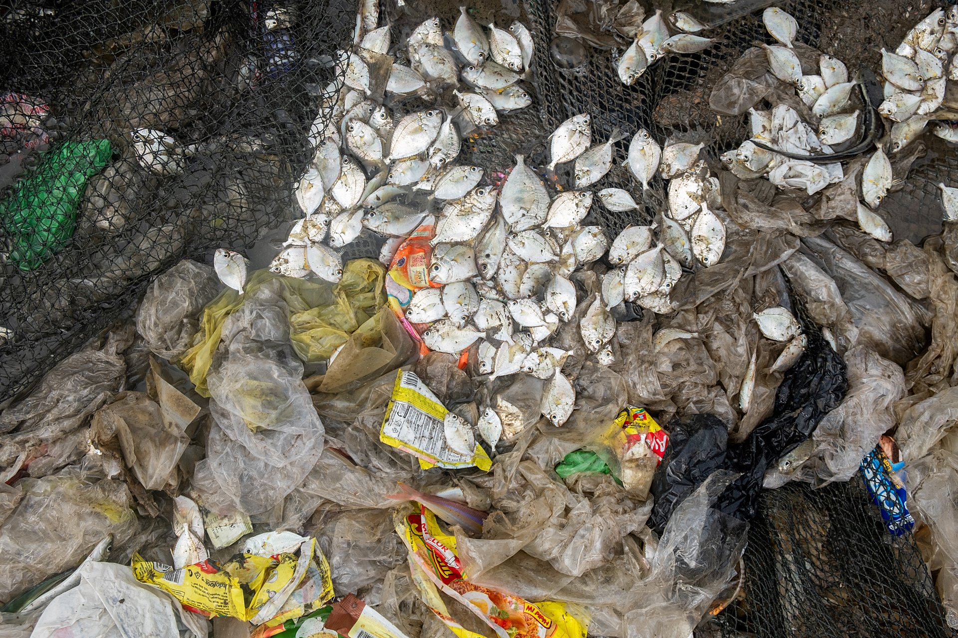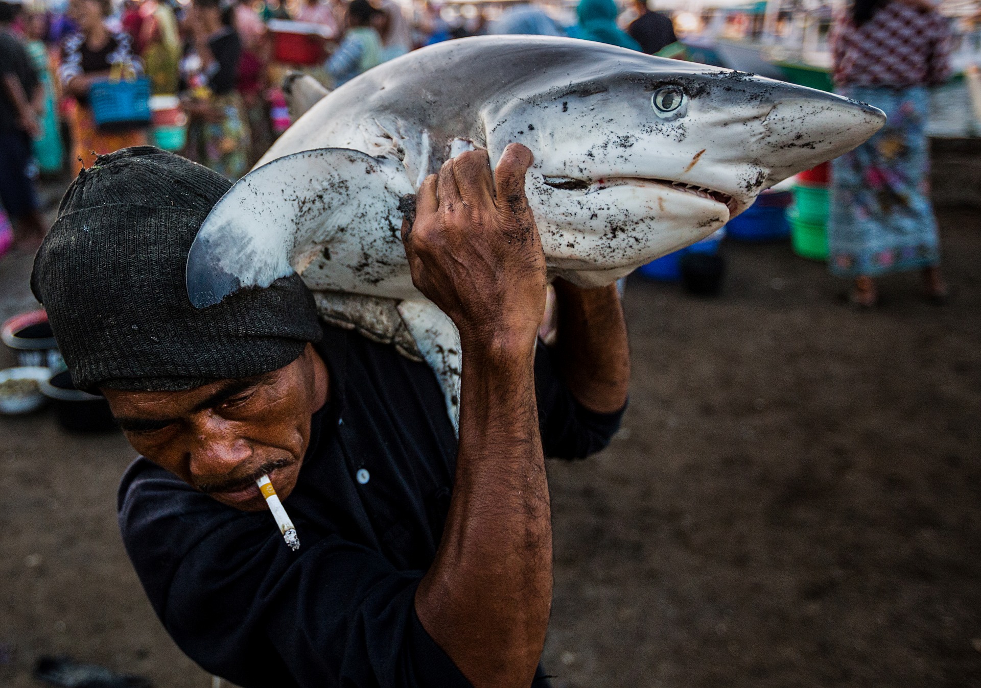 Tourists watch an Asian elephant forced to swim underwater for performances. Khao Kiew Zoo, Thailand, 2019. Photo: Adam Oswell / HIDDEN / We Animals.Unlucky number 7. An immobilised pig awaits the administration of an infusion in a jugular catheter. Spain, 2019. Photo: Carlota Saorsa / HIDDEN / We Animals.A fisherman carries a shark at a market in a region that’s one of the largest exporters of shark fin to China. Lombok, Indonesia, 2013. Photo: Paul Hilton / Earth Tree Images / HIDDEN / We Animals.Dead ponyfish mixed with plastic waste lie inside a trash-filled fishing net. The accumulated plastic waste polluting the area is reported to negatively impact marine life, the environment, and coastal residents’ health. Sukaraja Beach, Bandar Lampung, Lampung, Indonesia, 2024. Photo: Resha Juhari / We Animals.