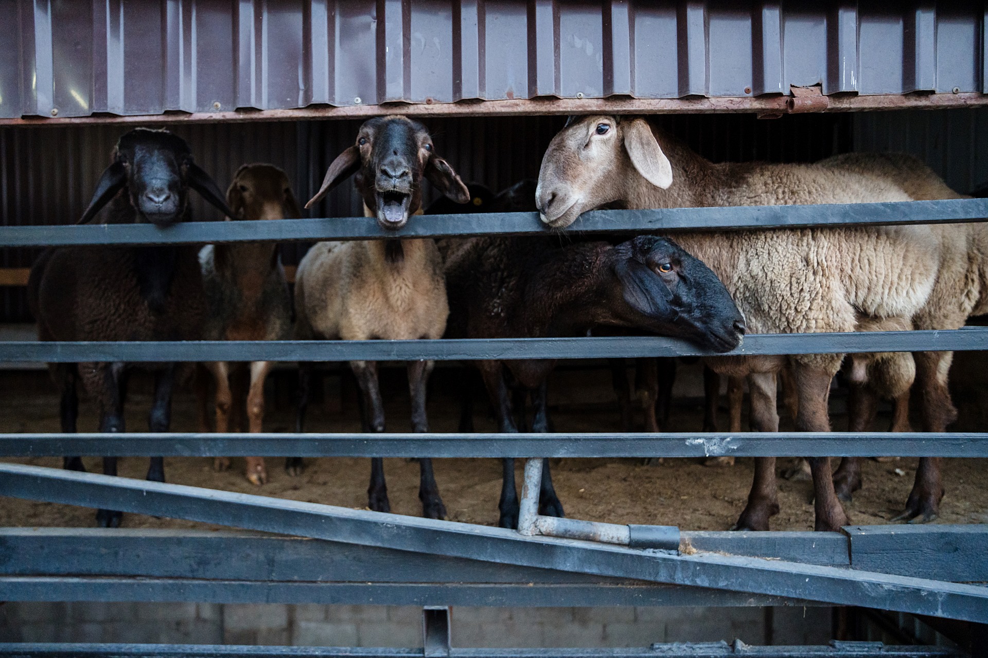 At this slaughterhouse, sheep await slaughter in an outdoor enclosure before being taken inside individually or in pairs, with one often witnessing the death of the other. Workers handle the animals roughly, sometimes dragging them by the leg. Inside, each sheep is immobilized on their back with bound legs in a metal butchering cradle, where a worker cuts their throat with a knife. Without stunning, the animals struggle after being cut, attempting to kick in a futile attempt to escape. Reports estimate sheep may remain conscious for up to 20 seconds after their throats are cut, experiencing pain and significant distress. After death, their heads are severed, with post-death muscle reflexes continuing as their bodies bleed out. Though executed with methodical efficiency, the entire slaughter process can take several minutes, with the animals appearing to suffer an agonizing death.