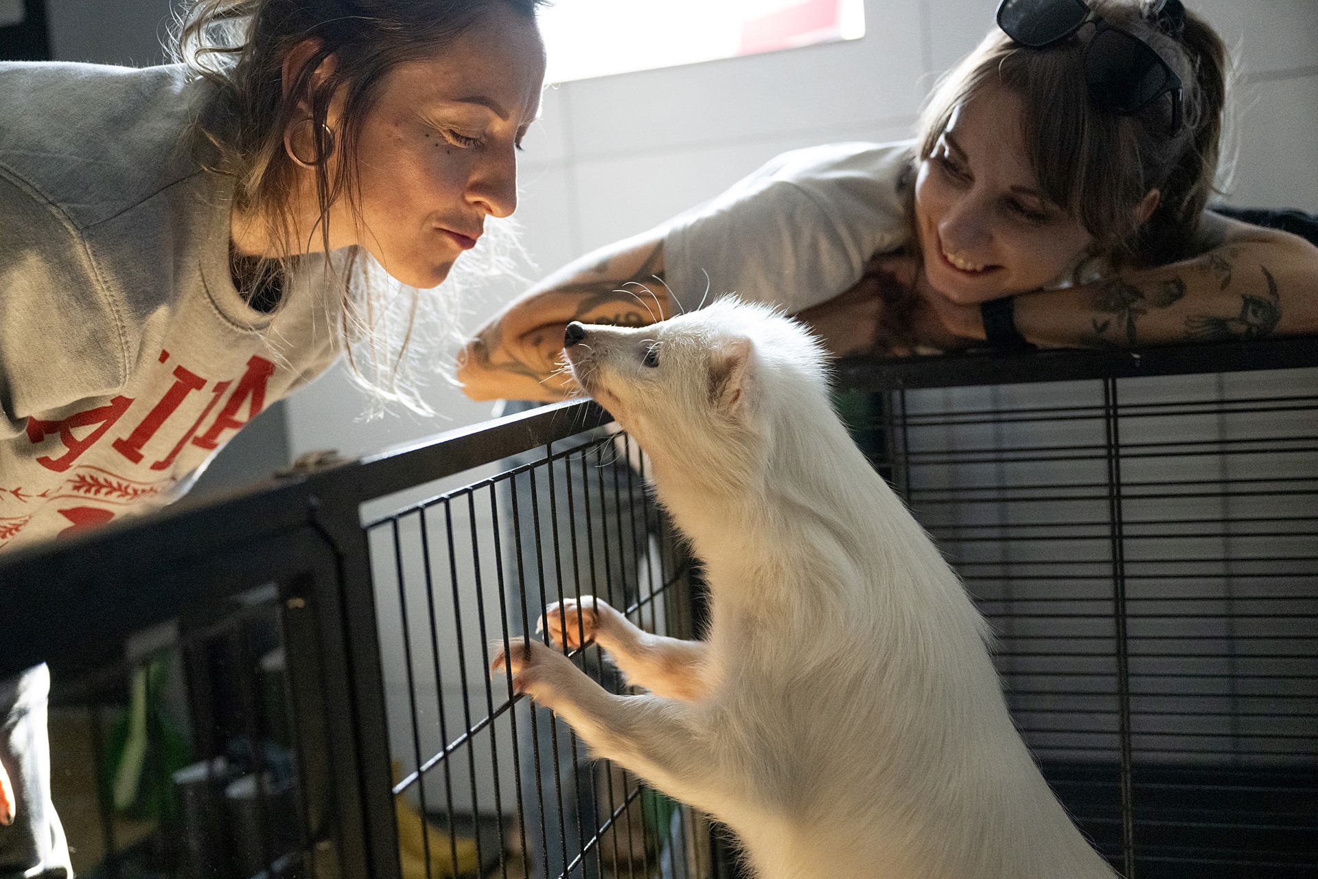 Sylwia Prokopiak (left) and investigator and animal advocate Bogna Wiltowska (right) interact with Buba, a female white raccoon dog rescued from a fur farm the previous night. Now awake after sleeping in a temporary cage following her rescue, Buba is curious when people come in to see her. She sniffs at people and accepts treats. Poland, 2024. Photo: Jo-Anne McArthur / Anima International / We Animals.