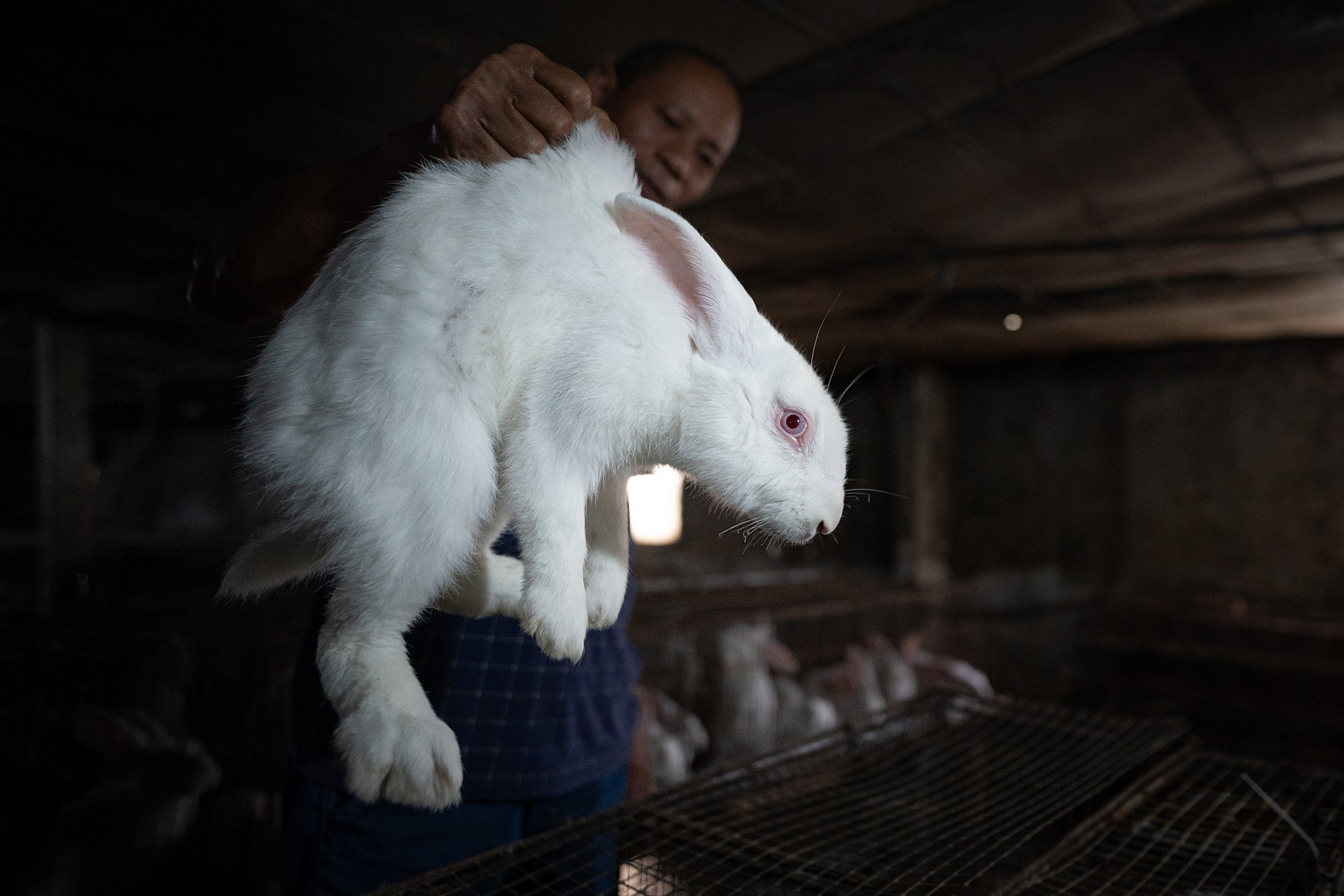 A rabbit hangs from the grip of a worker at an intensive farm that raises rabbits for meat, supplying them to street and wet markets, and private customers. This rabbit has been chosen for slaughter. Undisclosed location, Hanoi, Red River Delta, Vietnam, 2024. Photo: Human Cruelties / We Animals.
