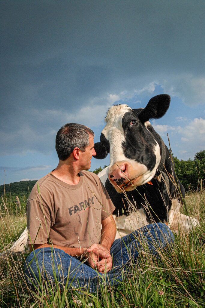 Gene Baur and Opie at Farm Sanctuary. Gene rescued Opie from a pile of dead animals when he was a calf. Farm Sanctuary, Watkins Glen, New York, USA, 2007. Photo: Jo-Anne McArthur / We Animals.