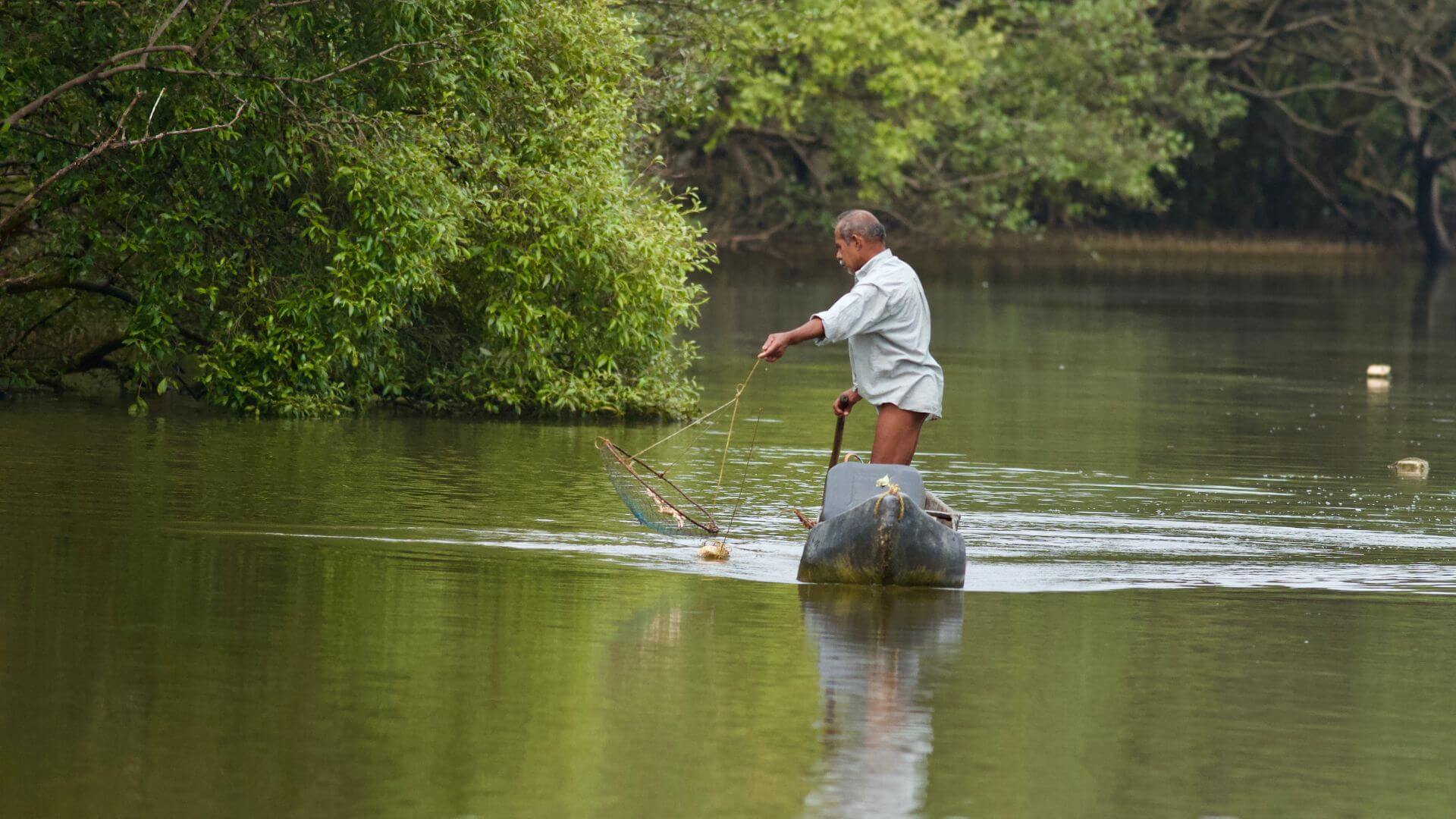 A fisherman casting his net in an otter habitat. A smooth-coated otter family heading towards the fishing net. Otters often feed from man-made fishing pools. At times they even feed on the fish caught in fishing nets.