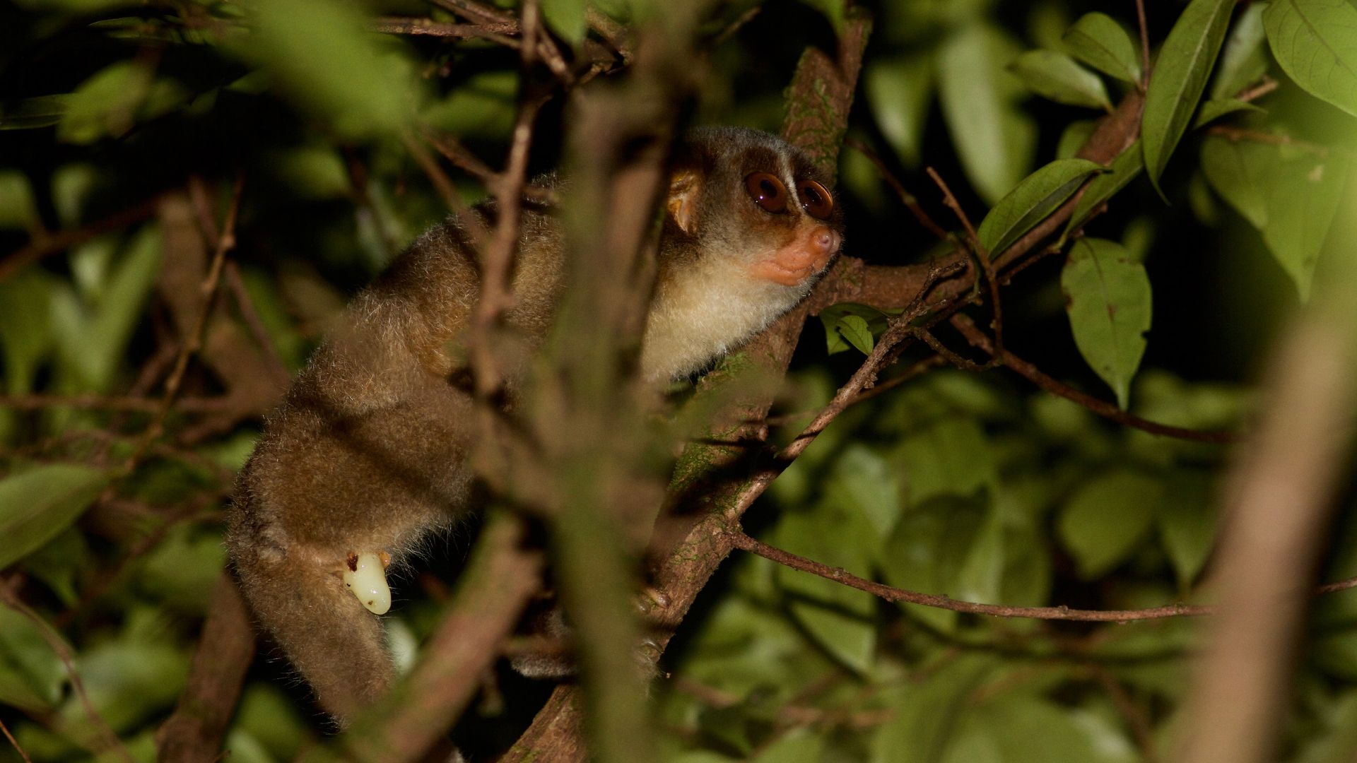 Slender Loris is the only nocturnal primate found in India. The individual in this photo is feeling content as it has just finished courtship. It is looking upwards at its partner.